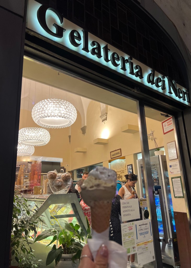 Photo of the pistacchio-stracciatella gelato cone, with the focus on the Gelateria dei Neri storefront.